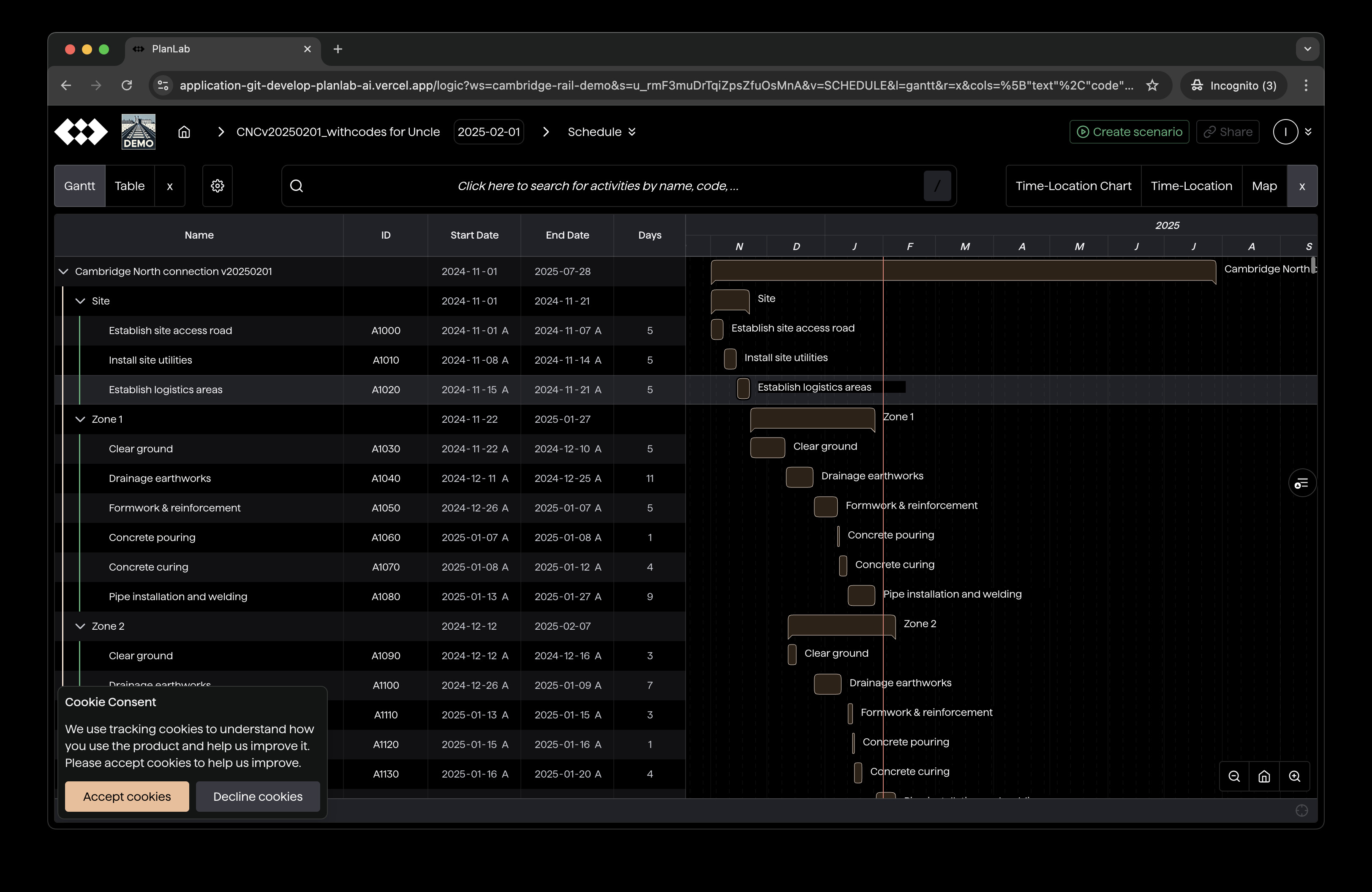 A table of activities paired with a Gantt chart is an old concept, but making this concept fast and useful in the web platform, accessible to anyone with a browser without installation, is not trivial. We have undergone five generations of our schedule viewer/editor component.